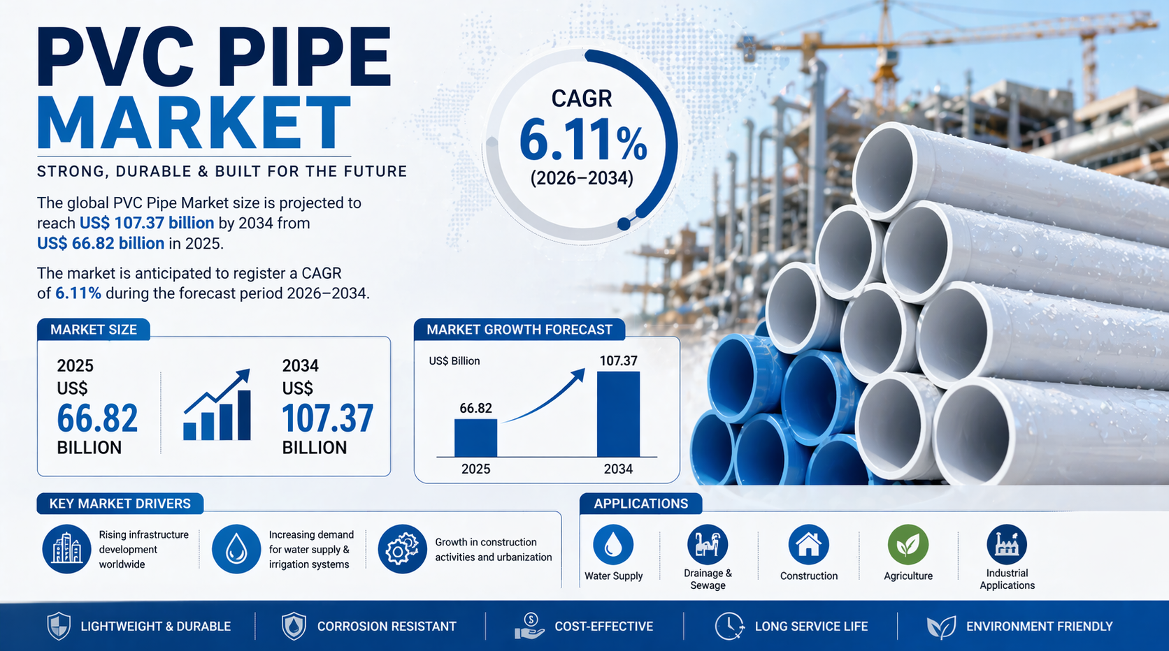 世界の建設および公益事業分野では、従来の配管資材に代わり、先進的なポリマーソリューションが台頭することで、根本的な変革が進行しています。この変革の最前線にあるのが「世界のPVCパイプ市場」であり、現在は力強い拡大期を迎えています。最新の業界分析によると、同市場の規模は2025年時点で668億2,000万米ドルと評価されており、2034年までには1,073億7,000万米ドルに達すると予測されています。この成長は、2026年から2034年の予測期間を通じて、年平均成長率(CAGR)6.11%という着実な伸びを示すものです。